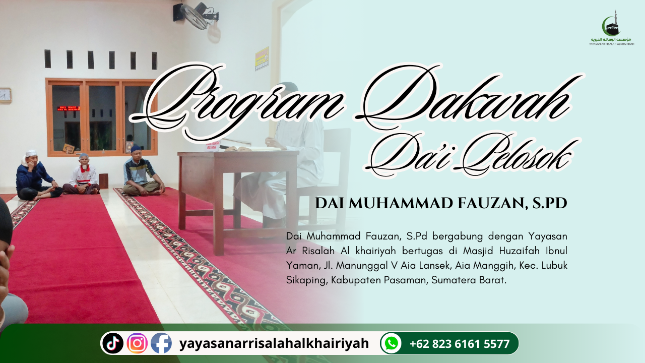Da’i Muhammad Fawzan bergabung dengan Yayasan Ar-Risalah Al-Khairiyah pada tahun 1446 H/2024 M untuk memulai tugas dakwahnya di Masjid Hudzaifah bin Al-Yaman yang terletak di Jalan Matugal, daerah Aia Lansi Pek, Aia Manggih, Lubuk Sikaping, Kabupaten Pasaman Barat, Sumatera Barat. Masa pengabdiannya dijadwalkan selama satu tahun, setelah ia menyelesaikan pendidikan tinggi dengan gelar sarjana dari Universitas Sunna Islam (STAI) pada tahun 2024 M.