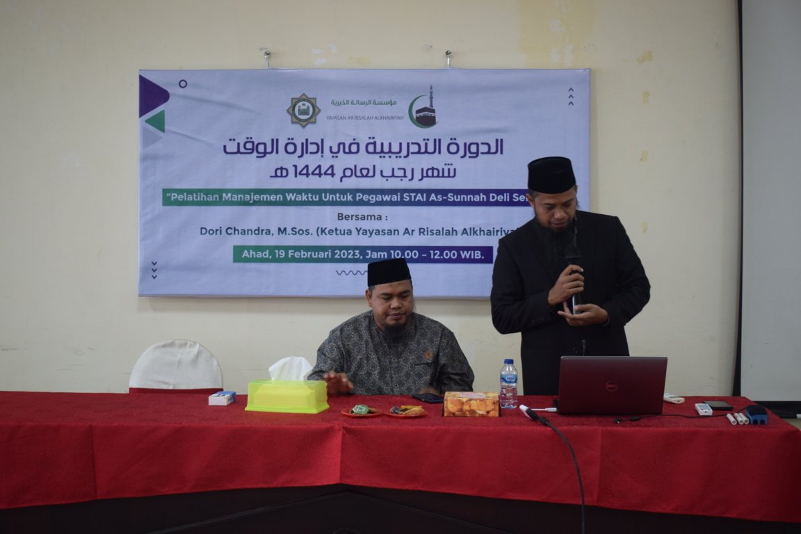 Divisi pelatihan yayasan Ar Risalah Alkhairiyah mengadakan pelatihan manajemen waktu untuk pegawai STAI As-Sunnah Deli Serdang pada tanggal 28 rajab 1444 h / 19 februari 2023, yang bertindak sebagai pemateri adalah bapak Dori Chandra, M.Sos. Peserta yang mengikuti pelatihan ini berjumlah 18 orang.