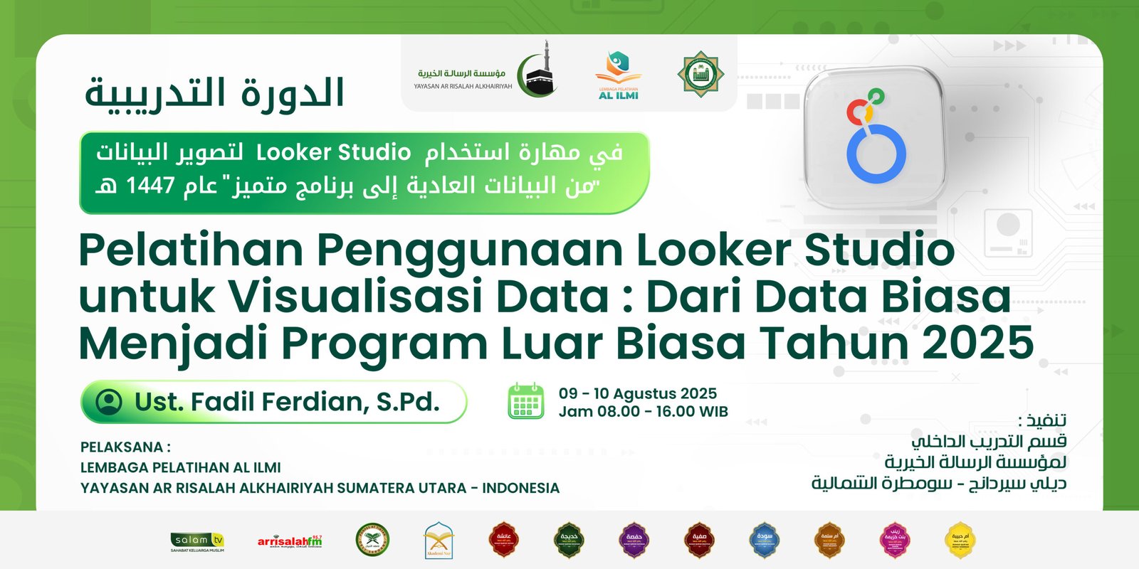 Lembaga Pelatihan Al Ilmi Yayasan Ar Risalah Alkhairiyah sukses menyelenggarakan Pelatihan Penggunaan Looker Studio untuk Visualisasi Data: Dari Data Biasa Menjadi Program Luar Biasa bagi para pegawai Yayasan. Pelatihan berlangsung selama dua hari, mulai pukul 08.00 hingga 16.00 WIB, bertempat di ruang pelatihan Yayasan Ar Risalah Alkhairiyah.