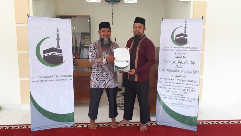 Setelah tiga bulan proses pembangunan, Alhamdulillah Yayasan Peduli Kemanusiaan Arrisalah telah meresmikan Masjid no 100 diberi nama Masjid Ayyash bin Abi Rabiah Radhiallahu ‘Anhu, yang berukuran 13m x 13m dan falisitas tempat wudhu berukuran 4m x 5m.
