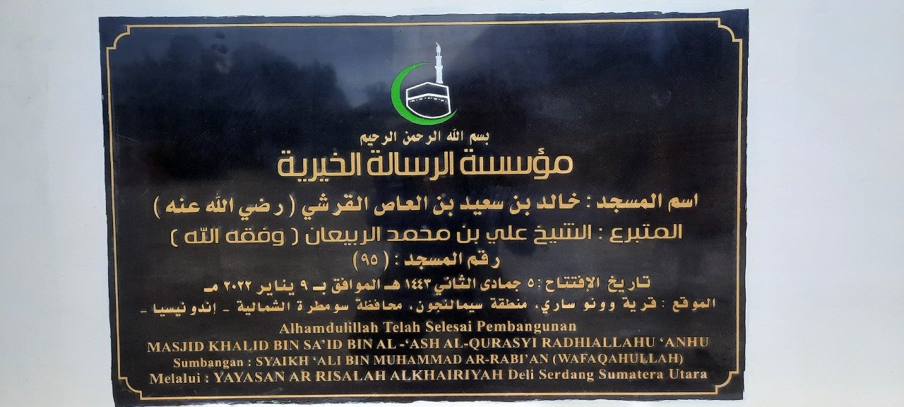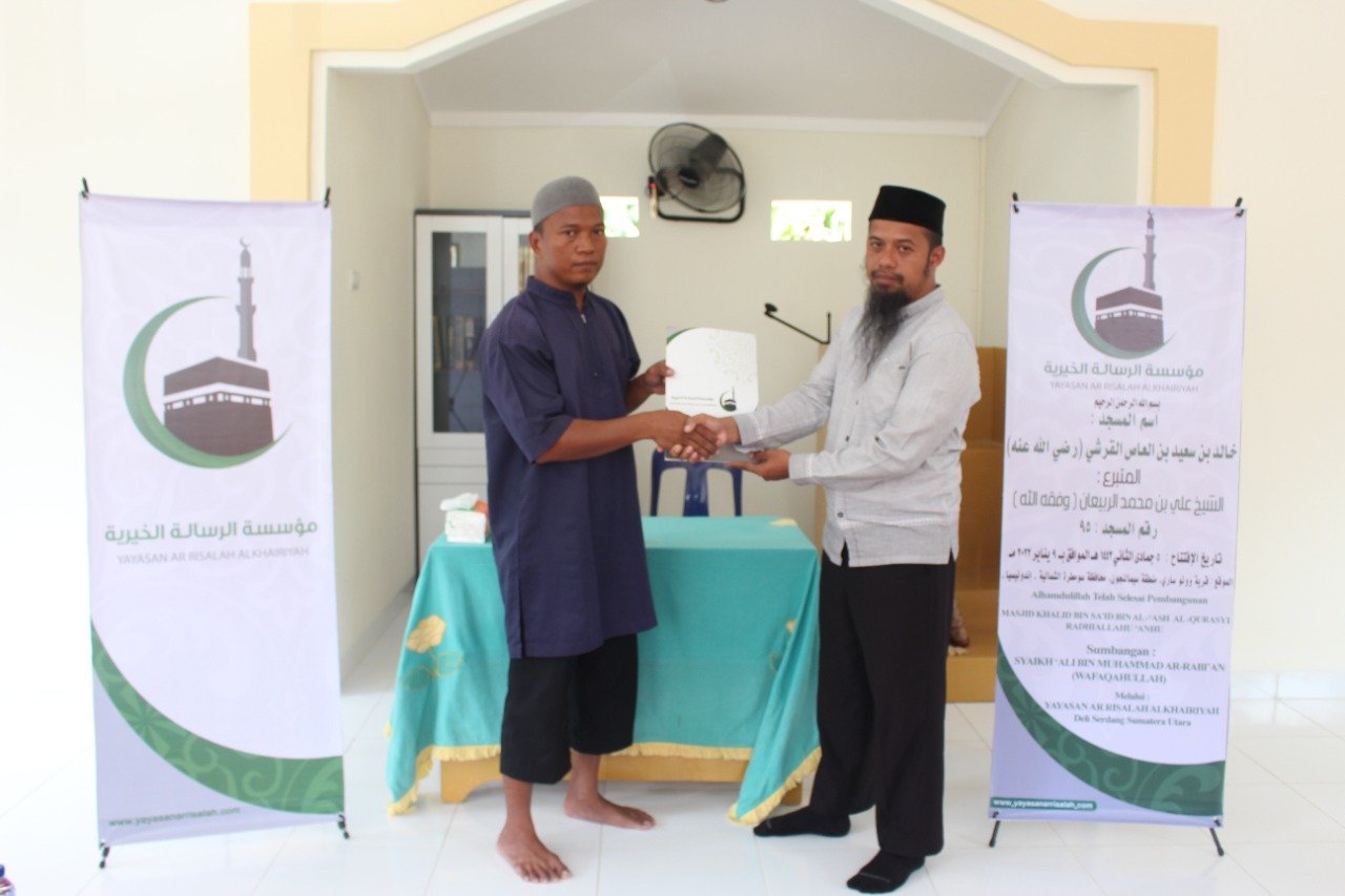 Yayasan Ar-Risalah Alkhairiyah meresmikan masjid no. 95 di Nagori Sordang Bolon, Kec. Ujung Padang, Kab. Simalungun, Sumut, dengan luas bangunan masjid 10m x 10m dan tempat wudhu 3m x 4m serta kapasitas penampungan jamaah 160 org.