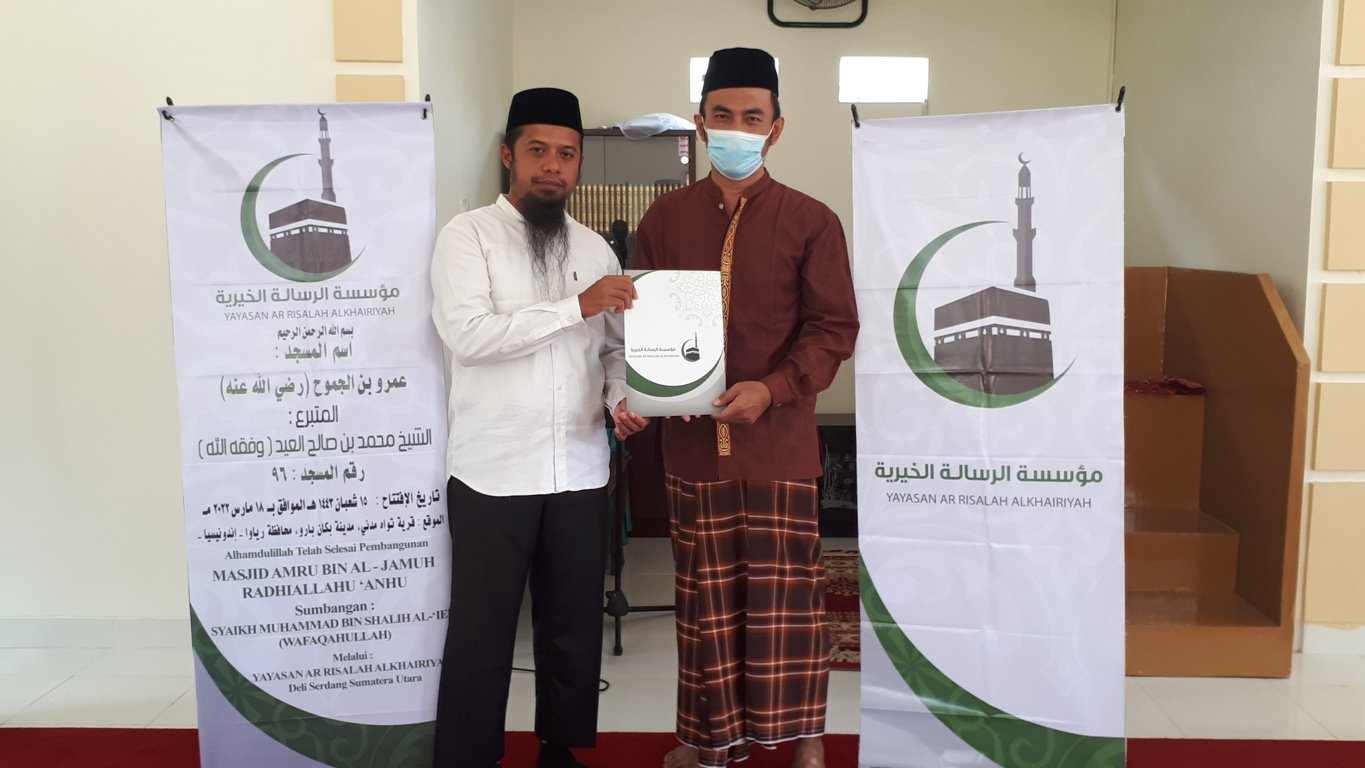 Setelah empat bulan proses pembangunan, Alhamdulillah Yayasan Ar Risalah Alkhairiyah telah meresmikan Masjid no 96 diberi nama Masjid Amru Bin Al-Jamuh Radhiallahu ‘Anhu, yang berukuran 13m x 13m dan falisitas tempat wudhu berukuran 4m x 5m.