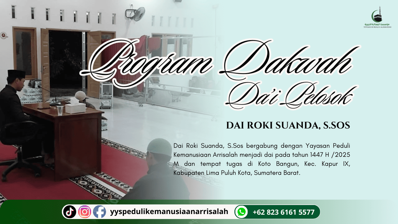 Dai Roki Suanda, S.Sos. bergabung dengan Yayasan Peduli Kemanusiaan Arrisalah pada tahun 1447 H / 2025 M. Beliau ditugaskan di Koto Bangun, Kecamatan Kapur IX, Kabupaten Lima Puluh Kota, Sumatera Barat. Hingga saat ini, beliau telah mengabdi sebagai dai selama kurang lebih tujuh bulan.