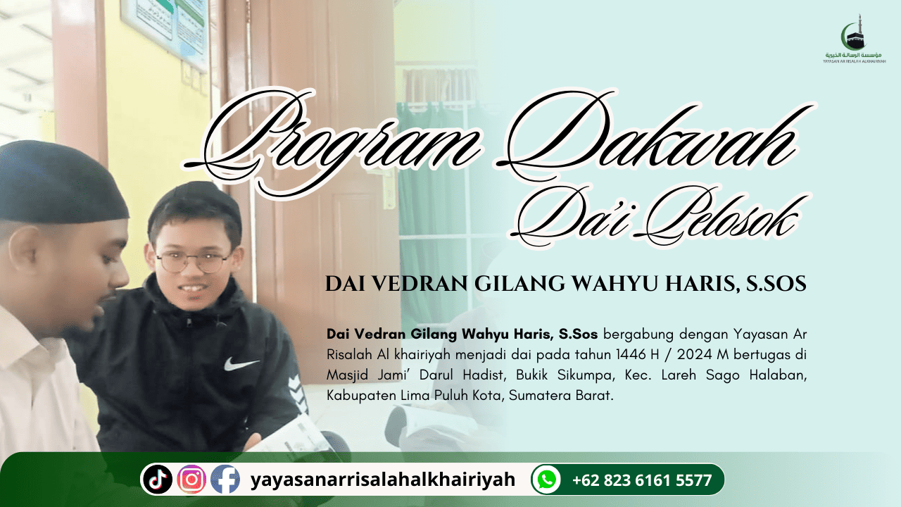 Dai Vedran Gilang Wahyu Haris, S.Sos, bergabung dengan Yayasan Ar Risalah Al Khairiyah sebagai dai pada tahun 1446 H / 2024 M. Saat ini, beliau bertugas di Masjid Jami’ Darul Hadist, yang berlokasi di Bukik Sikumpa, Kecamatan Lareh Sago Halaban, Kabupaten Lima Puluh Kota, Sumatera Barat.