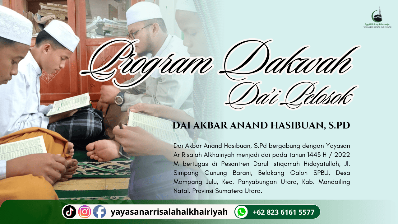 Dai Akbar Anand Hasibuan, S.Pd bergabung dengan Yayasan Ar Risalah Alkhairiyah menjadi dai pada tahun 1443 H / 2022 M dan tempat tugas di Pesantren Darul Istiqomah Hidayatullah, Jl. Simpang Gunung Barani, Belakang Galon SPBU, Desa Mompang Julu, Kec. Panyabungan Utara, Kab. Mandailing Natal. Provinsi Sumatera Utara., Kab. Mandailing Natal, Provinsi Sumatera Utara. Sehingga -+3 tahun lamanya berkerja di Ar Risalah Alkhairiyah, dan menyelesaikan pendidikan Terakhir S1 di STAI As Sunnah – Deli Serdang Sumatera Utara Pada tahun 2022.